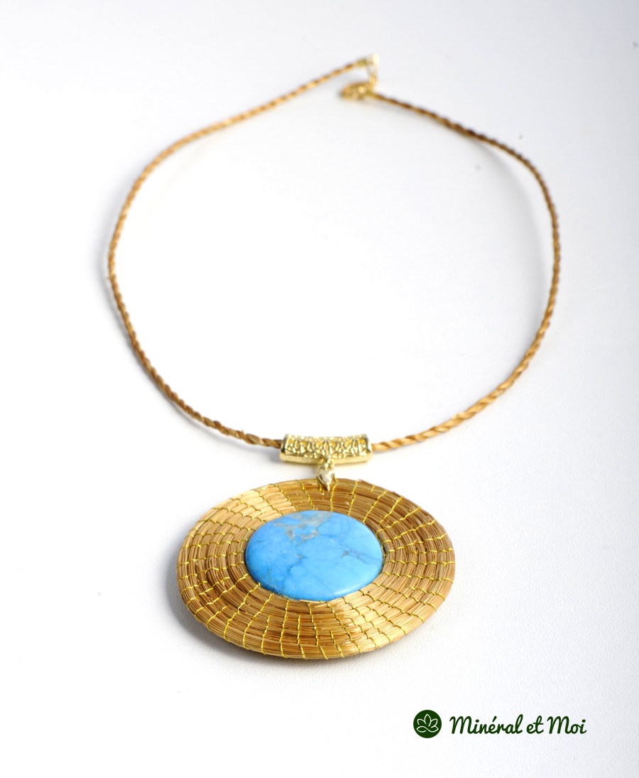 Ce collier en pierre naturelle est assemblé avec soins sur de l'Or Végétal. Tige de fleur endémique du Brésil, qui pousse de couleur naturellement dorée, s'adaptera facilement à vous.