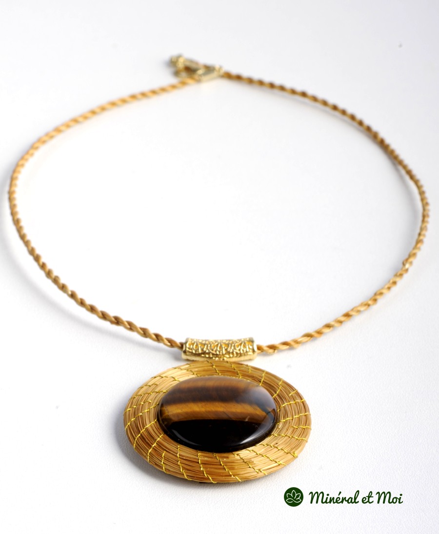 Ce collier en pierre naturelle est assemblé avec soins sur de l'Or Végétal. Tige de fleur endémique du Brésil, qui pousse de couleur naturellement dorée, s'adaptera facilement à vous.