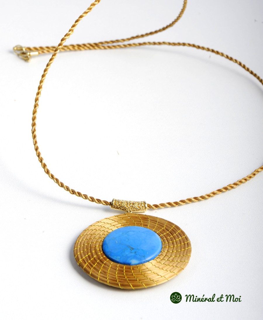 Ce collier en pierre naturelle est assemblé avec soins sur de l'Or Végétal. Tige de fleur endémique du Brésil, qui pousse de couleur naturellement dorée, s'adaptera facilement à vous.